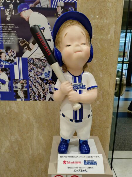 横浜高島屋のマスコット「ローズちゃん」が、横浜DeNAベイスターズのユニフォームを着て立っています。